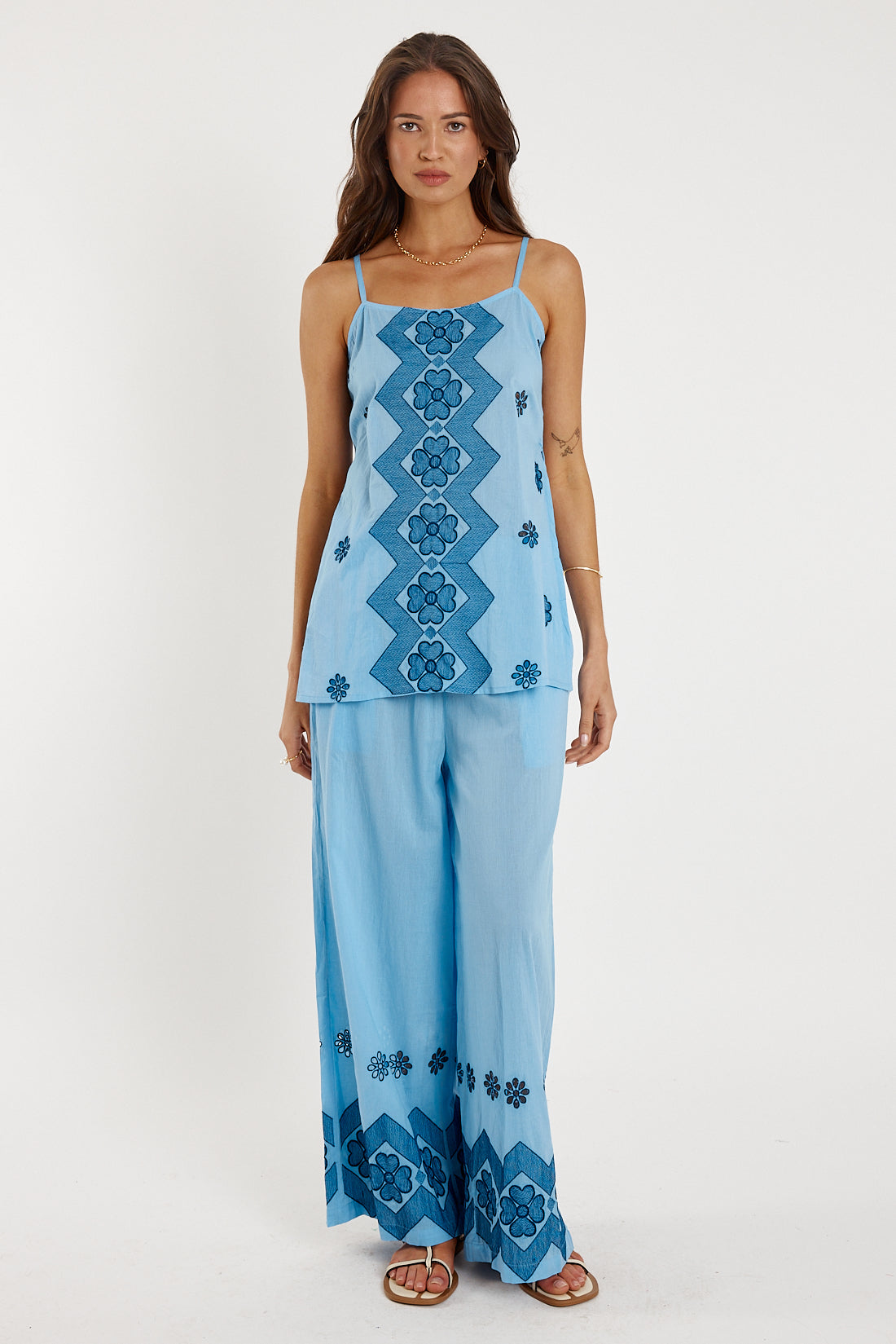 Elevate your everyday wardrobe with the Ravello Pant in Blue. Crafted from premium 100% cotton, these sophisticated trousers offer exceptional comfort and breathability. The elasticated waist ensures an effortless fit, while the true-to-size cut provides a flattering silhouette. Delicate embroidered detailing adorns the hemline, adding refined elegance to a timeless design. Practical side pockets complete this versatile essential, perfect for seamless transitions from day to evening.