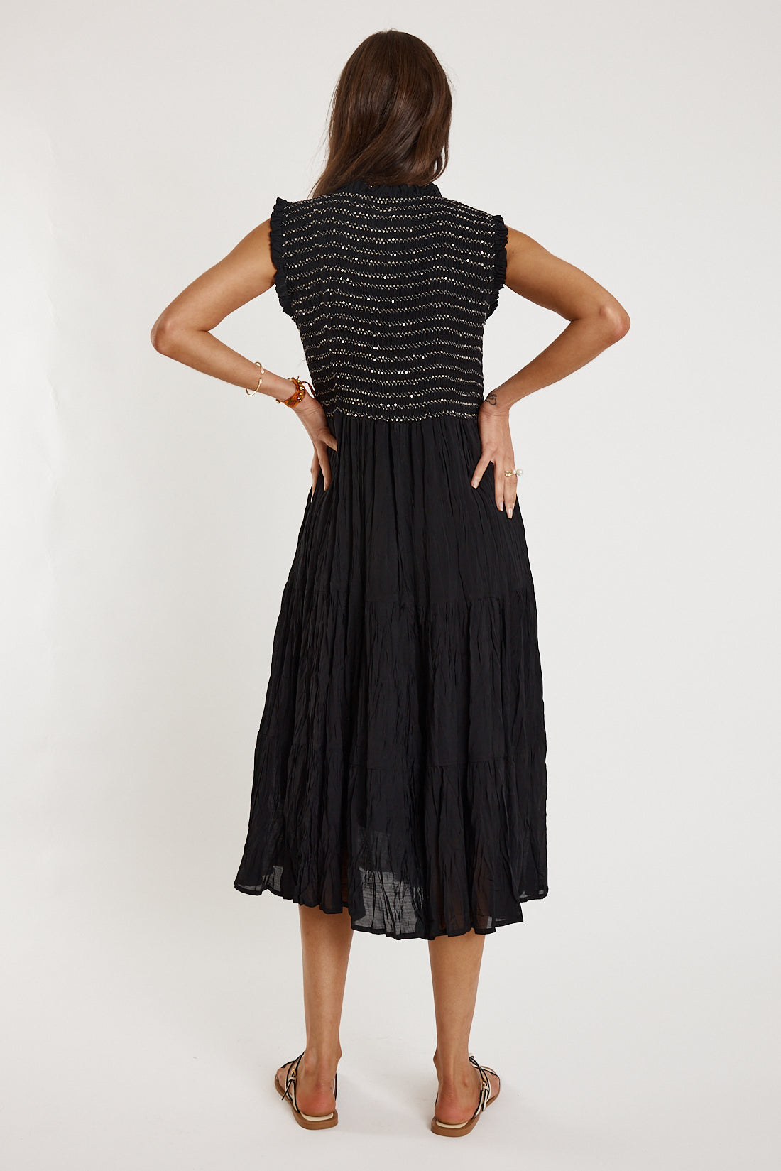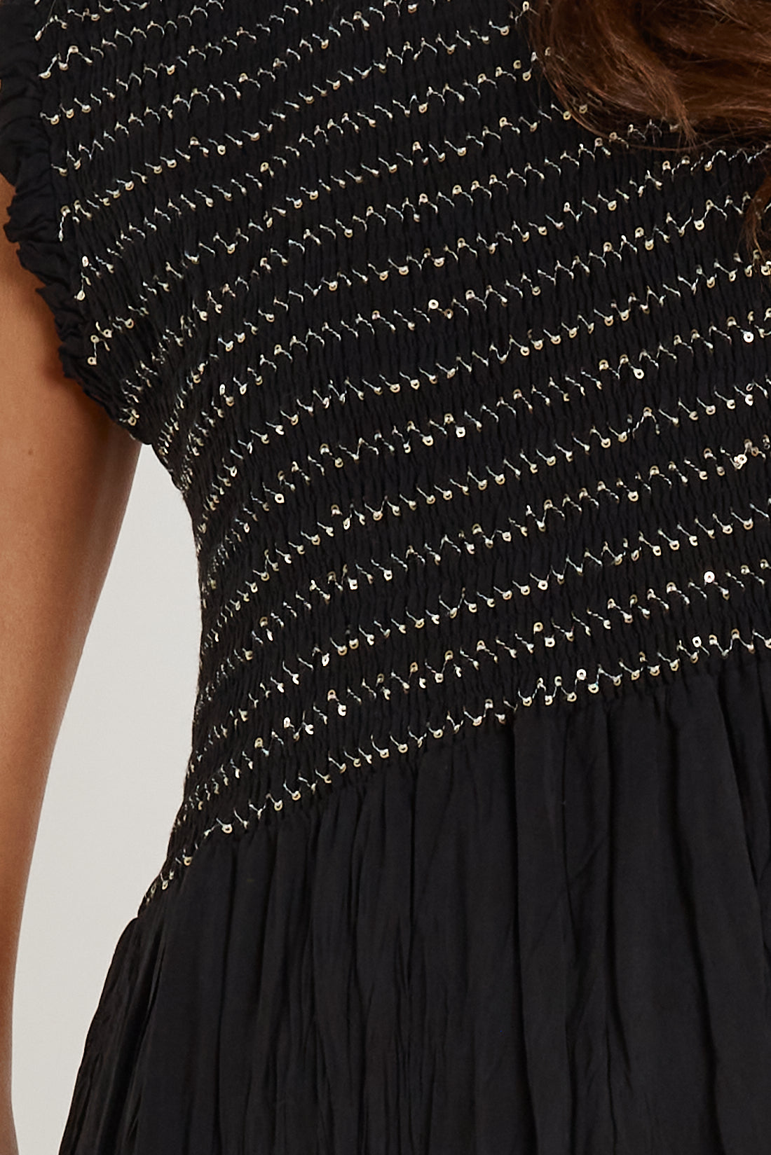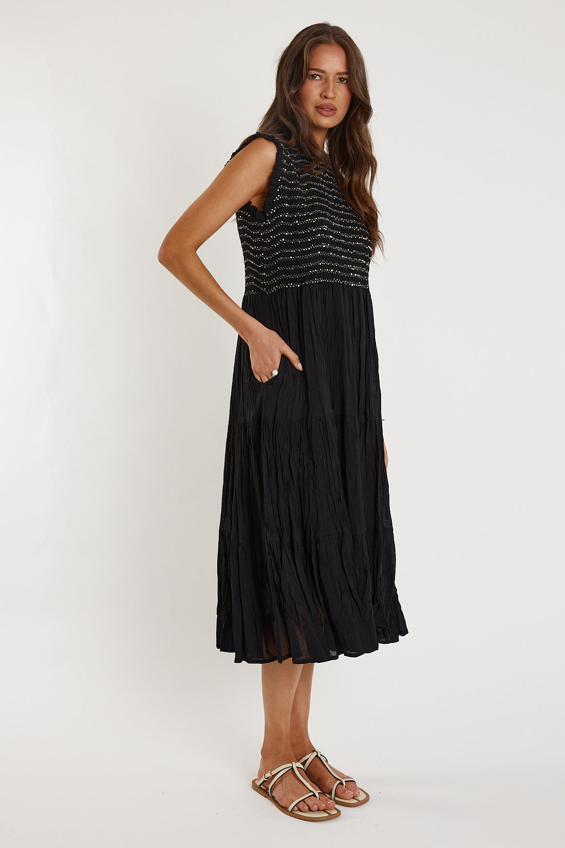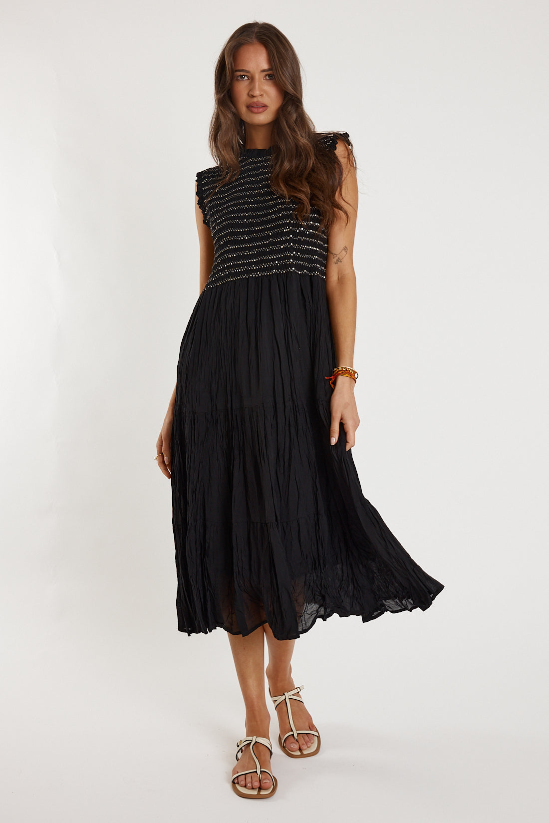 Elevate your evening wardrobe with the Jolie Maxi Black, a sophisticated statement piece crafted from luxurious 100% viscose. This stunning floor-length gown features a shirred bodice adorned with delicate sequin detailing that catches the light beautifully, while the tiered skirt creates graceful movement and dimension. Perfect for special occasions, this dress combines refined elegance with modern design for an unforgettable look.