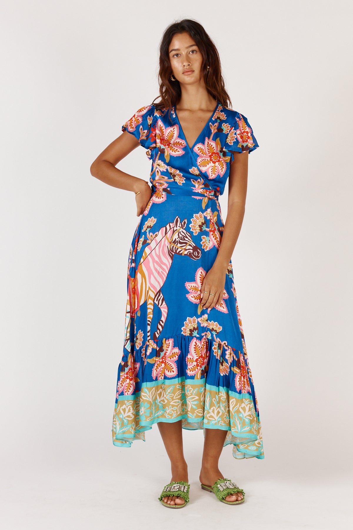 Crafted from luxurious 100% viscose satin, this Tango Wrap Print dress offers a sophisticated silhouette with its flattering V neckline and short sleeves. The wrap style, enhanced by an attached tie belt, gently accentuates the waist, while the semi-fitted midi length creates an elegant, timeless look. Designed to fit true to size, this dress seamlessly blends comfort and refinement for any occasion.