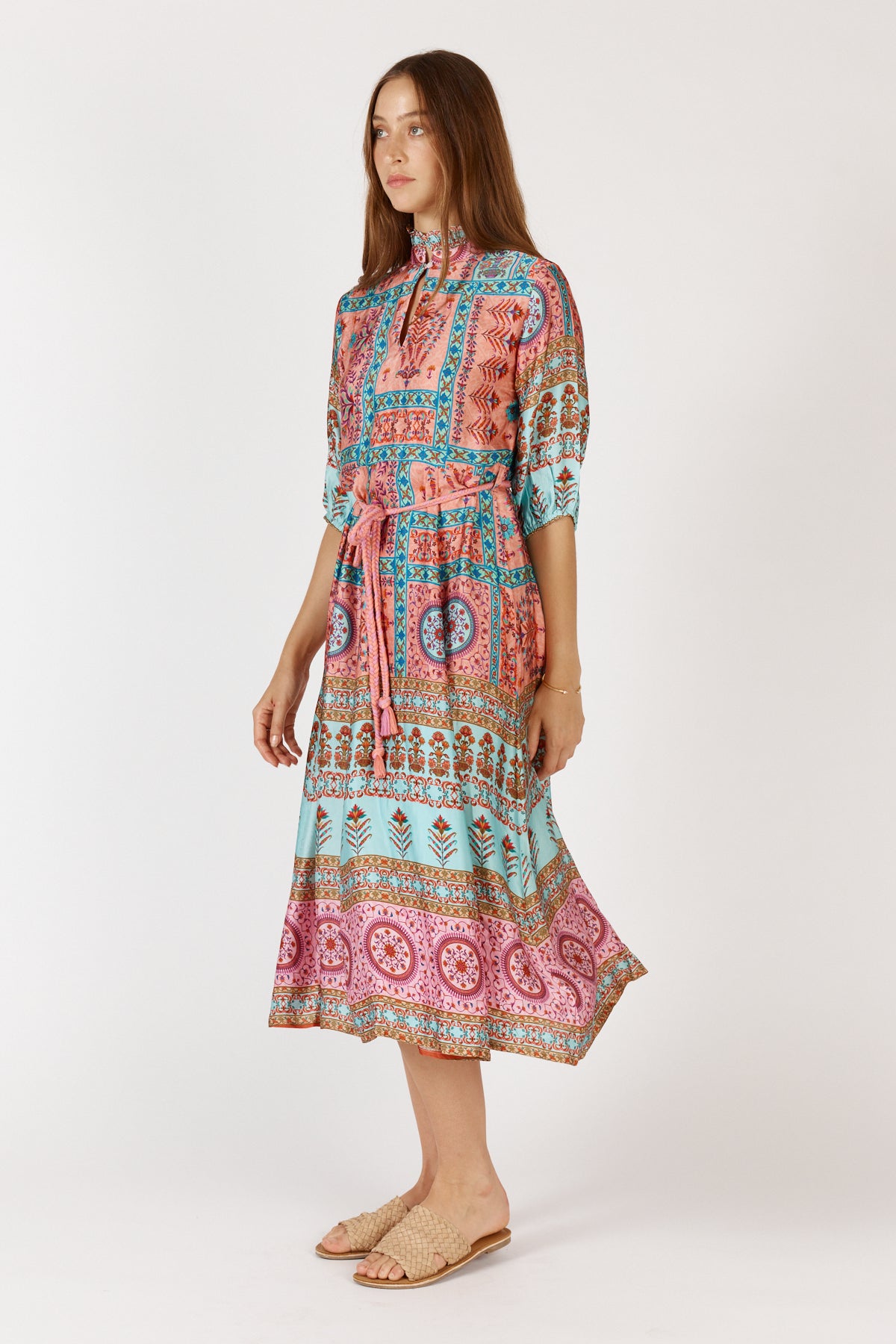 Experience refined elegance with the Tirupati Maxi Print, made from smooth 100% viscose satin. Its high neck with a subtle front slit and relaxed silhouette exude effortless style. The 3/4 length sleeves and functional side pockets add practicality, while the self-tie belt allows you to define your waist gracefully. Designed for ease, this sophisticated maxi dress is suitable for gentle machine washing, making it both beautiful and easy to care for.