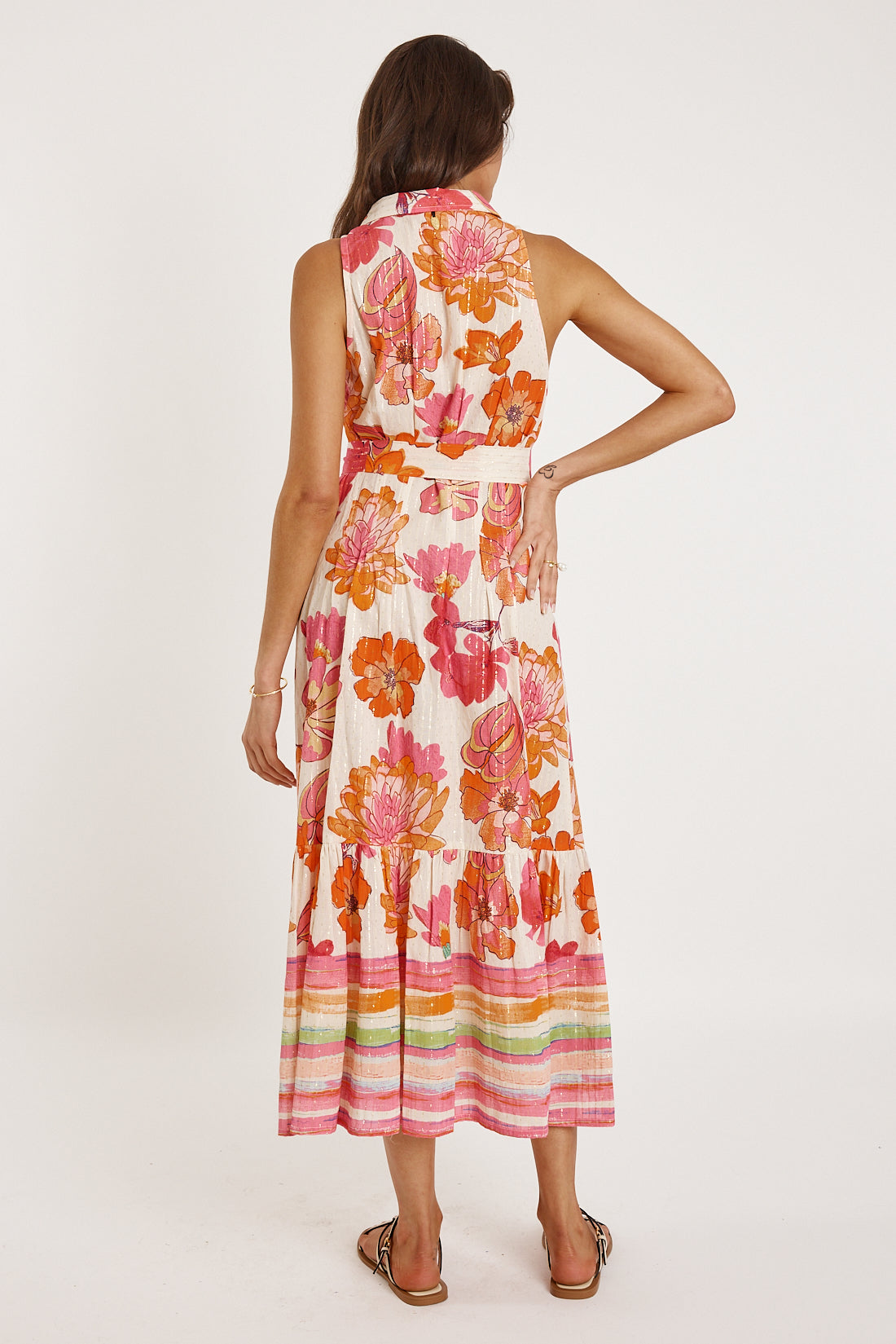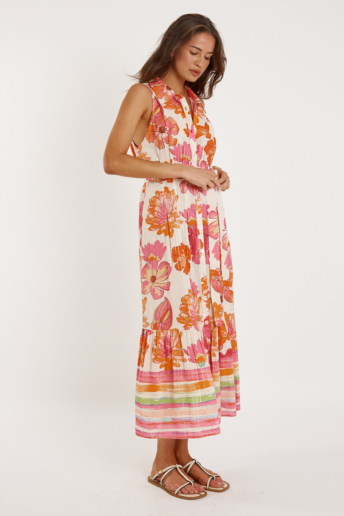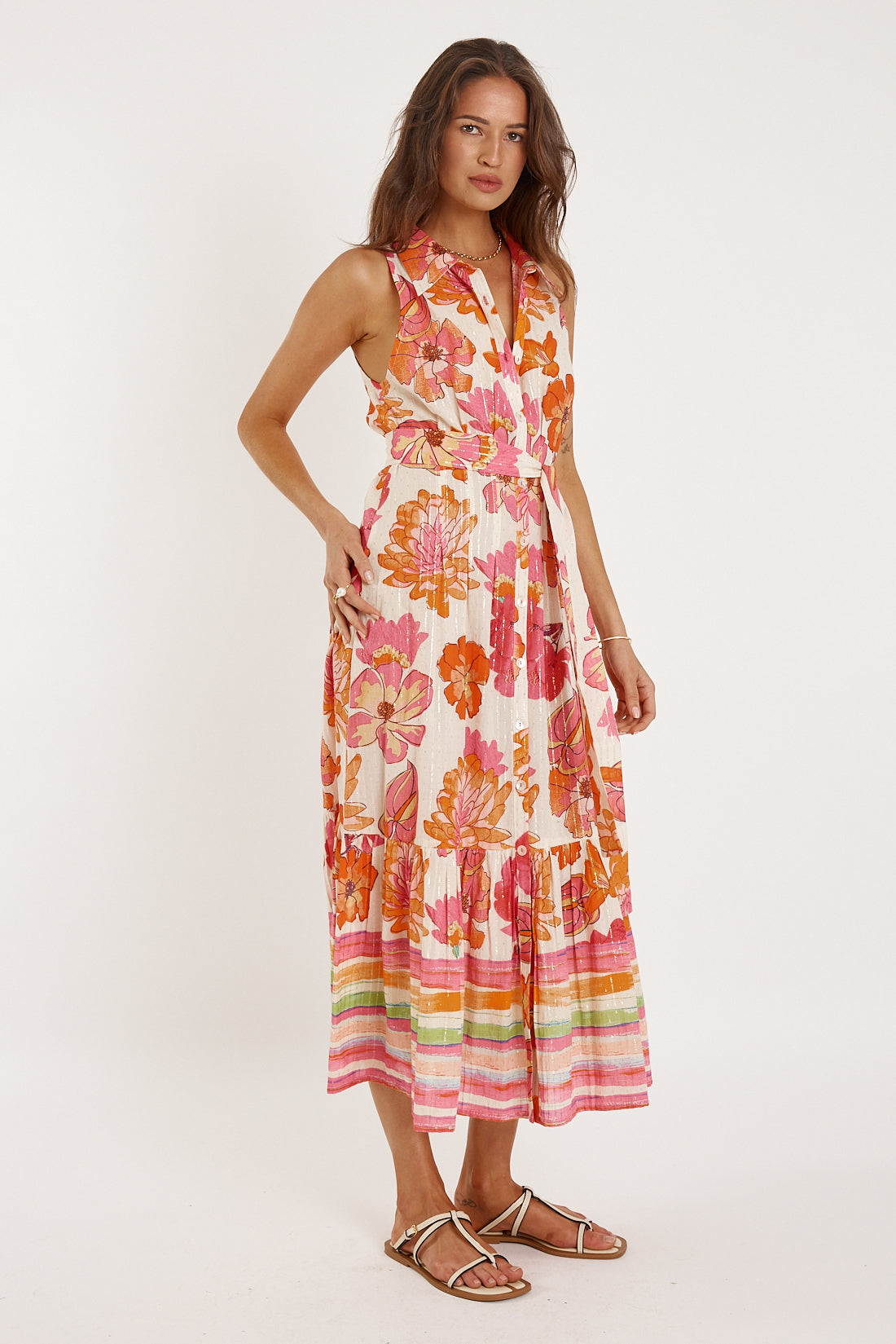 Embrace effortless elegance with this sleeveless cotton maxi dress, featuring a striking digital print in soft pink tones. The streamlined silhouette buttons all the way to the hemline for a polished, intentional look, while the included optional belt allows you to define your waist and personalise your style. Crafted from breathable 100% cotton, this versatile piece transitions seamlessly from day to evening occasions.