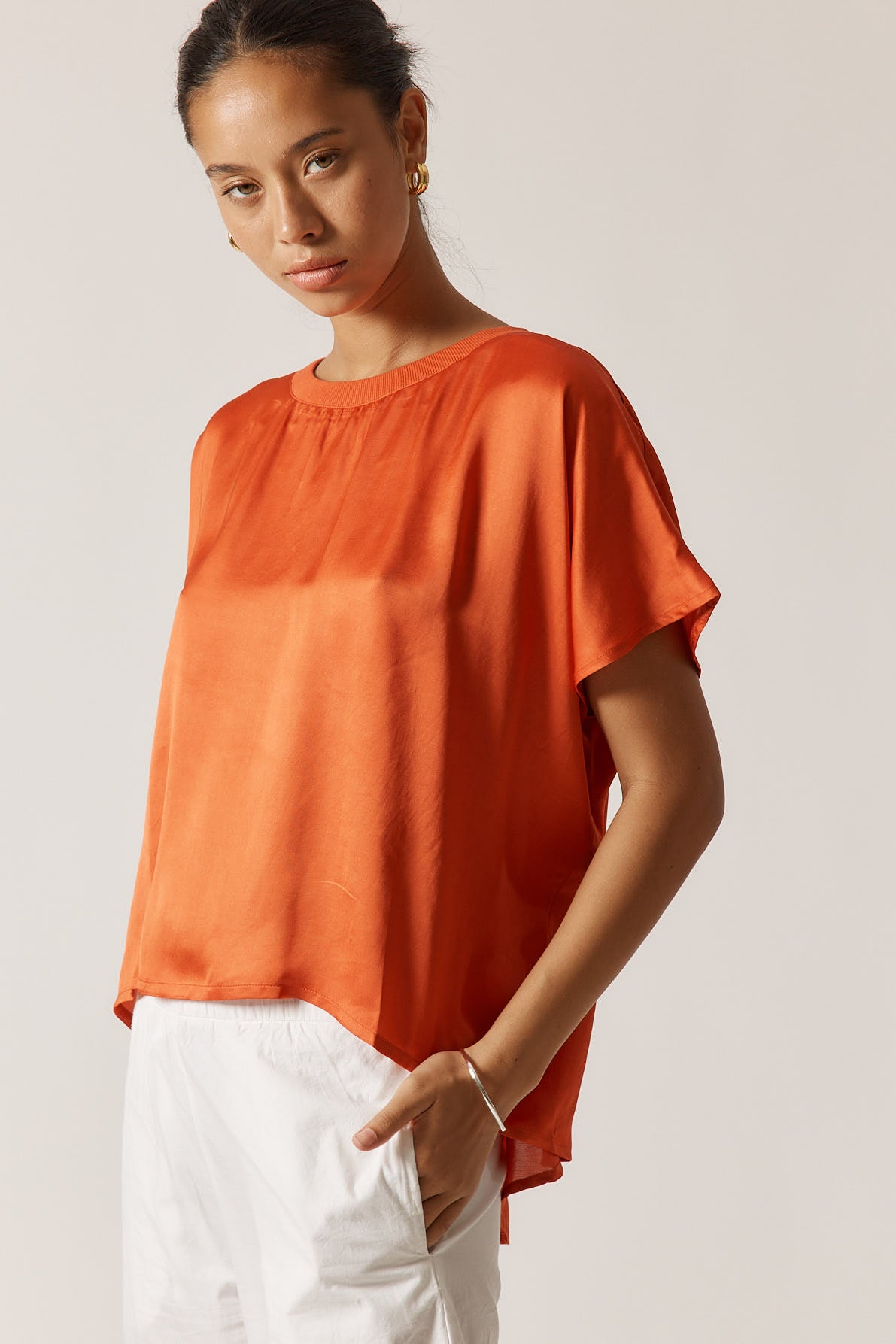Elevate your everyday wardrobe with this luxuriously crafted oversized tee. Constructed from 100% viscose satin, it drapes with an effortless elegance that feels as refined as it looks. The structured rib neckline and short sleeves create a polished silhouette, while the generous cut ensures comfort without compromise. Perfect for layering or wearing solo, this versatile piece transitions seamlessly from day to evening.