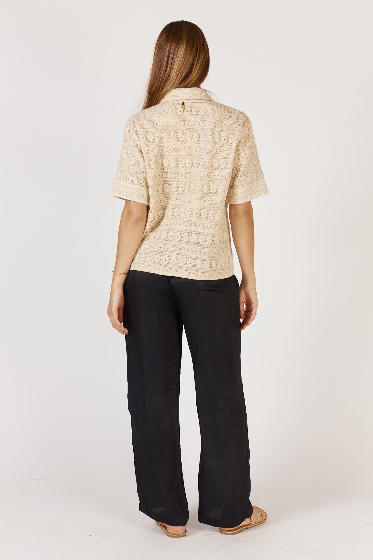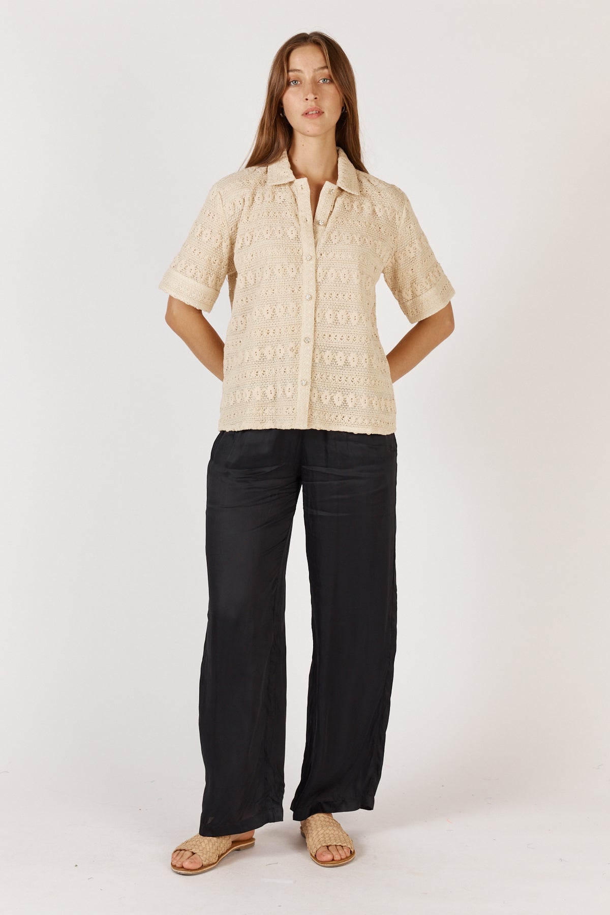 Crafted from 100% cotton mesh fabric, the Columbus Shirt Cream offers breathable comfort with a refined touch. Featuring a classic collar, short sleeves, and elegant diamante buttons, this button-through shirt combines sophistication with effortless style.